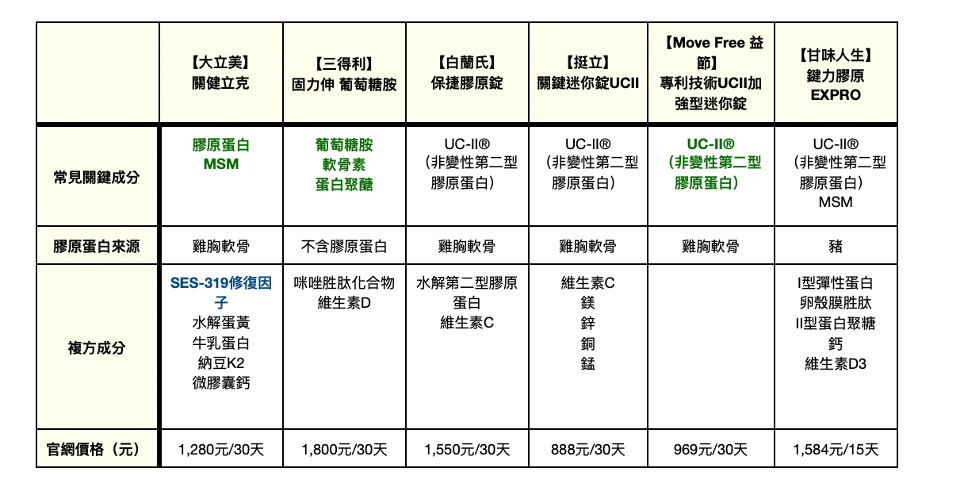 • 膠原蛋白與MSM複合:大立美、甘味人生。